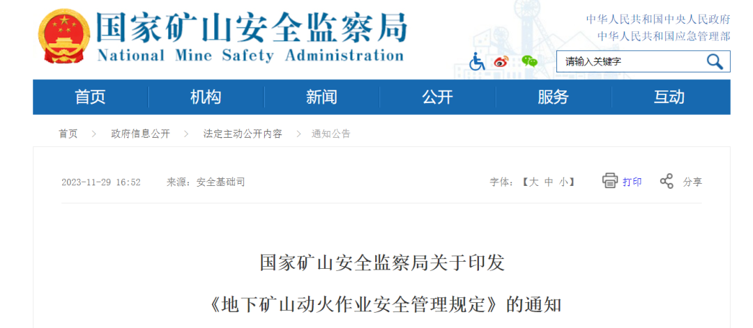 《地下矿山动火作业安全管理规定》已经国家矿山安全监察局2023年第28次局务会议审议通过,现印发给你们,请认真贯彻执行。