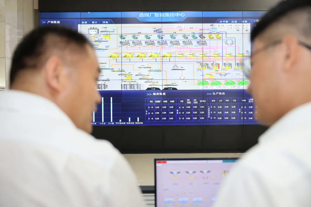走进该矿选煤厂集控调度中心,一面巨大屏幕上展示着整个厂区的生产现场实景图,可视化智能集控平台上的洗选系统一览无余,100余处现场画面自动切换,调度员可随时查看各个岗点的人员、设备及生产状况,大到原煤筛分、小到阀门开关控制,轻点屏幕即可操控调节。