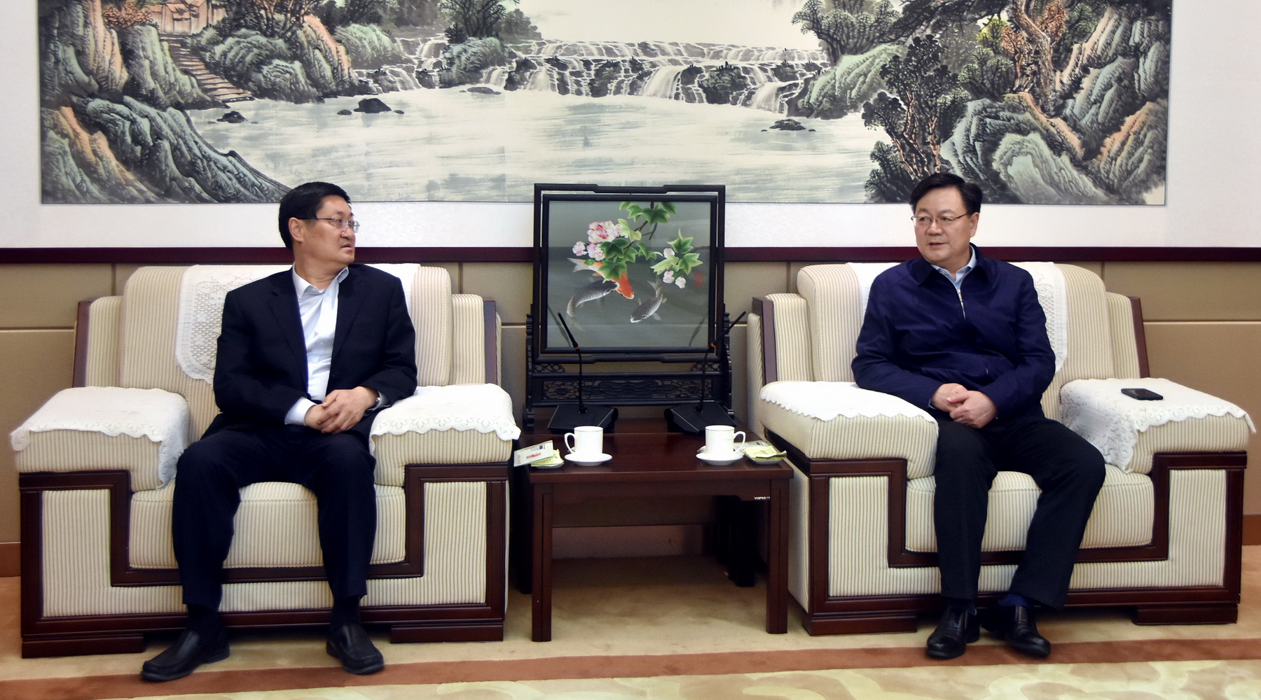 10月22日,枣矿集团党委书记、董事长杨尊献在集团总部会见中国农业银行山东省分行副行长马林一行。枣矿集团党委副书记、董事、总经理张延伟,财务总监、外部董事张功厚,董事会秘书、有关部门负责人参加会见。