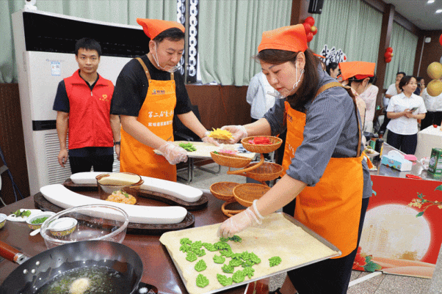 比赛分为规定点心制作和自选菜品制作两部分。在月饼制作环节,各个家庭迅速进入状态,揉捏饼皮、称量馅料、包坯压模……大家分工明确、动作娴熟、默契十足。随着模具一次次压下,印有传统花纹和“团圆”“美满”等吉祥字样的月饼胚便整齐排列开来,现场顿时弥漫开油糖与面点特有的香甜气息。