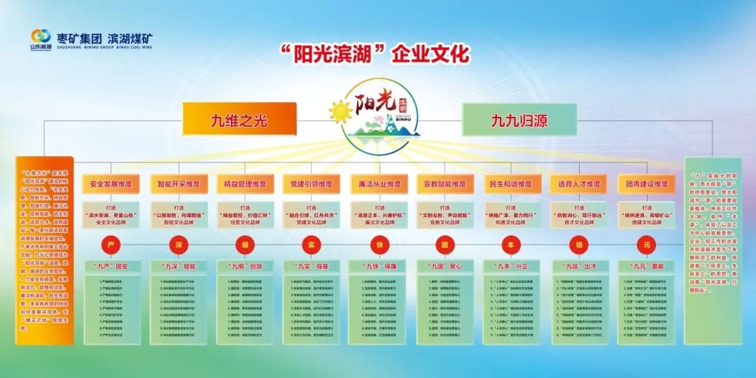 “阳光”代表着光明、温暖、积极向上、公开透明,与煤矿“开采光明”特性紧密贴合。“阳光滨湖”企业文化建设体系以“九维之光、九九归源”为内核,秉持“照亮发展前路,成就非凡价值”的理念,弘扬“求真务实、真抓实干”的作风要求,激励广大干部职工积极进取、勇于创新、自强不息。