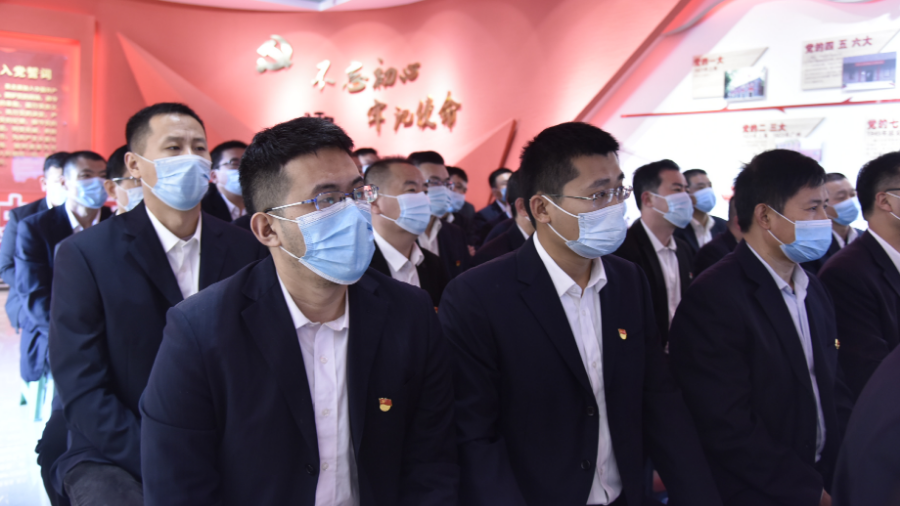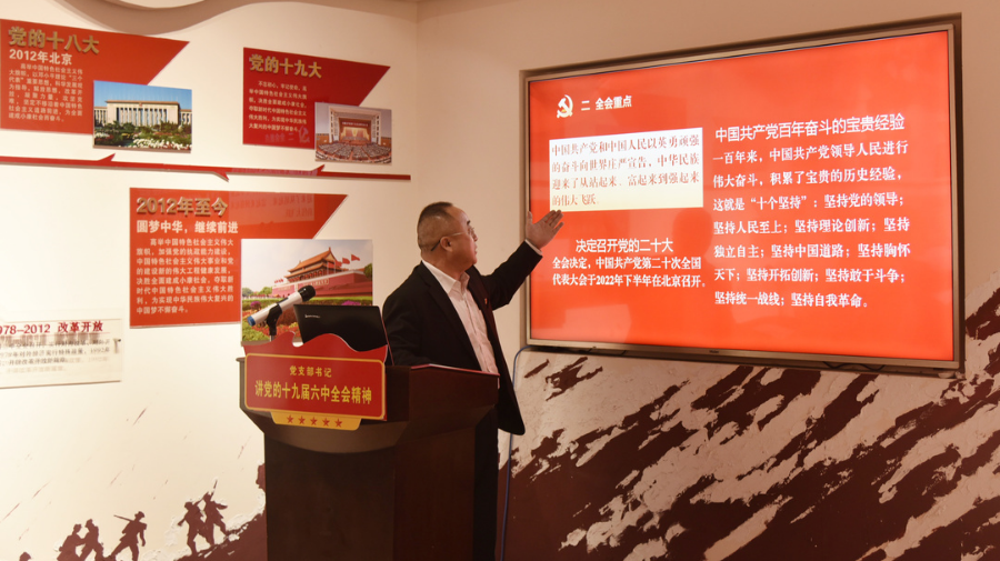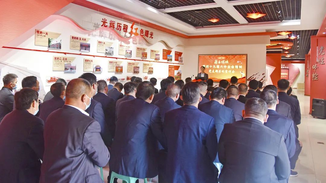 党旗夺目、党徽闪耀!“光辉历程、红色曙光”党史教育墙上,党的百年奋斗历程催人奋进——在“红色氛围”浓郁的党性体检教育基地,来自该矿采掘一线的党支部书记和部分党员代表一起徜徉在十九届六中全会精神海洋中,共同汲取全会知识营养,激发决战年终奋进力量。