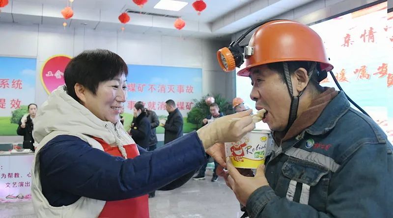 高煤公司在井口信息站开展了“严寒冬至暖意浓、亲情嘱安促生产”送温暖活动,职工及家属齐动手,现场擀面皮、包饺子……女工协管员和青年志愿者把热腾腾的饺子端给职工。当矿嫂王淑青看到升井的丈夫头戴矿灯迎面走来时,激动地夹了一个水饺放到丈夫嘴里,满脸幸福的为丈夫送上问候。
