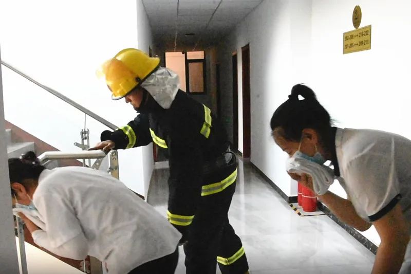 他们邀请了专业人员围绕消防安全知识、正确使用消防器材、消防逃生方法等进行了现场讲解和演示。在应急演练中,他们模拟教室发生火情,随着浓烟升起,学员在培训教师指挥下,用湿毛巾捂住口鼻,压低身体,迅速有序撤离到安全区域。“灭火组”立即赶到“起火点”,按照灭火器“一提二拨三握四压”使用方法,进行灭火,成功处置火情。