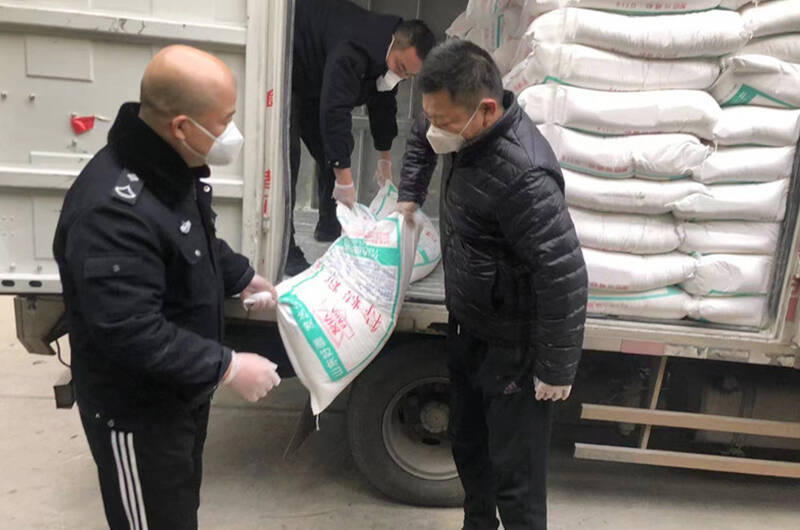先将一件件物资卸下车,再全部进行消杀,一件件整理物资编码和信息,并挨个给工人师傅打电话,以便第一时间发放到驻矿职工手中。