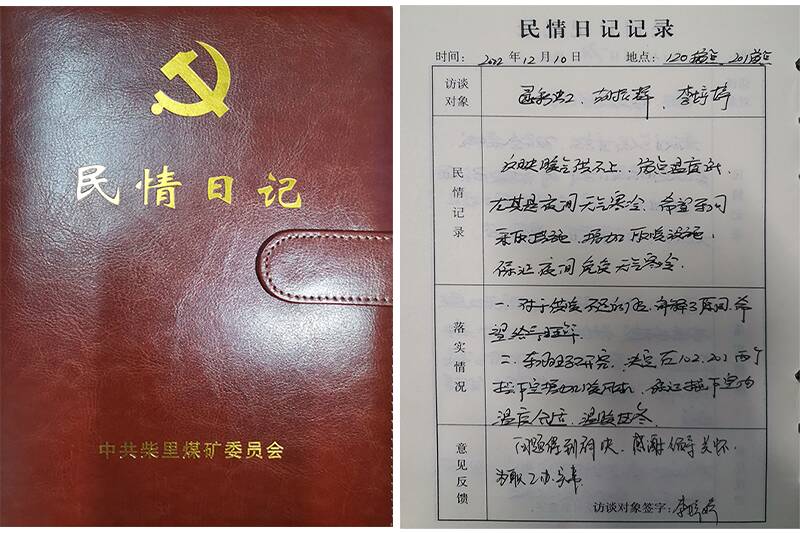 像这样的事还有很多。翻开该车间支部书记杜丙强的“民情日记”记录本,记录着“车间困难职工王钦龙、刘秀云在薛城同时住院,生活上存在困难”“天气冷了,早班时间能不能往后推半小时”“滚轴筛漏斗经常堵,车间科技攻关小组应该怎么办”“孩子开学没人送”……等等20多项意见和诉求,每一条都是职工在工作、生产中遇到的困难事,但每一项诉求的及时处理都是凝心聚力的推进剂,“民情日记”已成为联系职工、服务职工、解决问题的纽带。