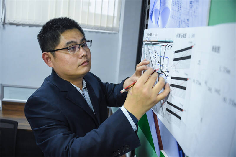 (张洪强在研究水文地质图纸)