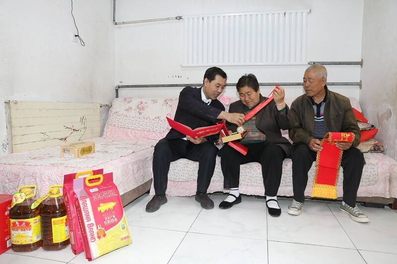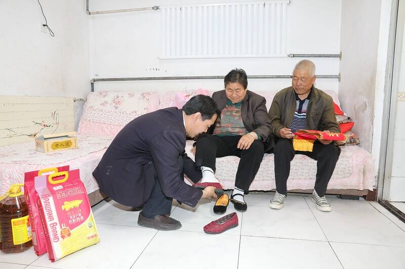 在枣矿集团柴里煤矿综采一区职工高东亚家中,高东亚一边为母亲送上枣矿集团劳动模范荣誉证书,一边为母亲穿上精心准备的鞋子,女工协管员们为高东亚母亲送上节日慰问的鲜花,亲情依依的画面定格在此刻。