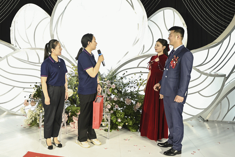 活动中,工会工作人员来到新婚职工的结婚典礼现场,为他们送上了精心挑选的新婚礼物,恭贺他们走进婚姻的神圣殿堂,翻开生活新篇章,希望他们在今后的生活工作中,能够持续创造幸福、传递幸福、分享幸福,在建设好自己的小家庭的同时再为“企业大家庭”作出积极贡献。