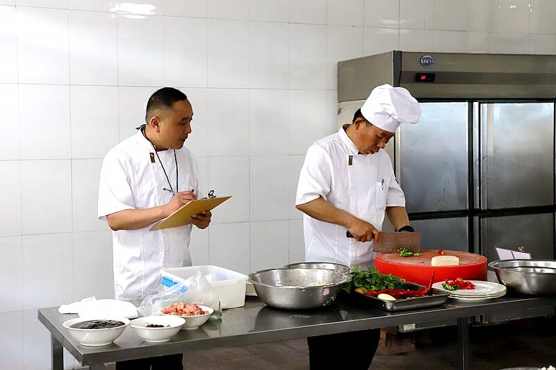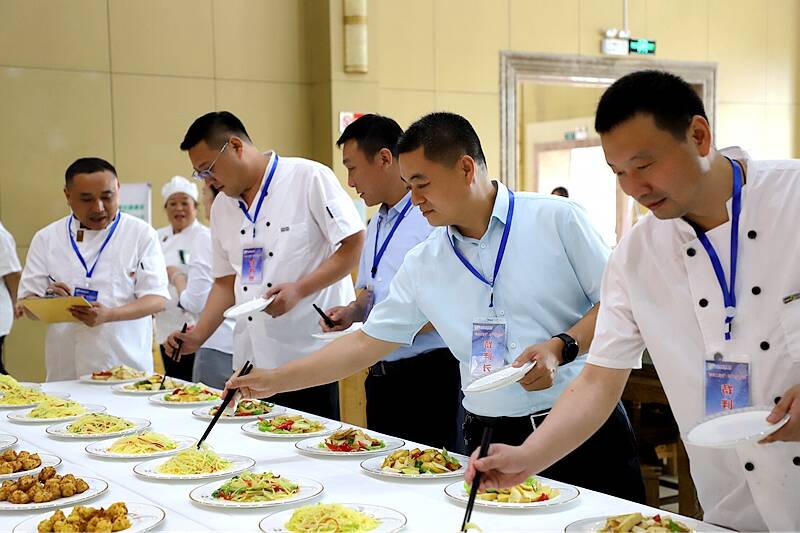 在比武现场,记者看到,选手们在刀工、烹饪、面食制作上展开竞技,个个精神饱满,翻锅扬铲,尽显身手,用平凡的家常食材打造了一场色香味俱全的美食盛宴。