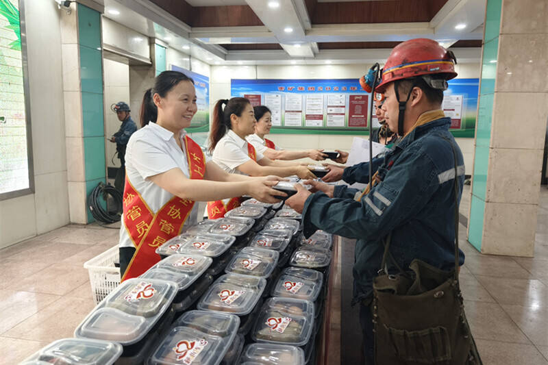 (女工协管员将粽子、鸡蛋等慰问品送到上下井职工手中)