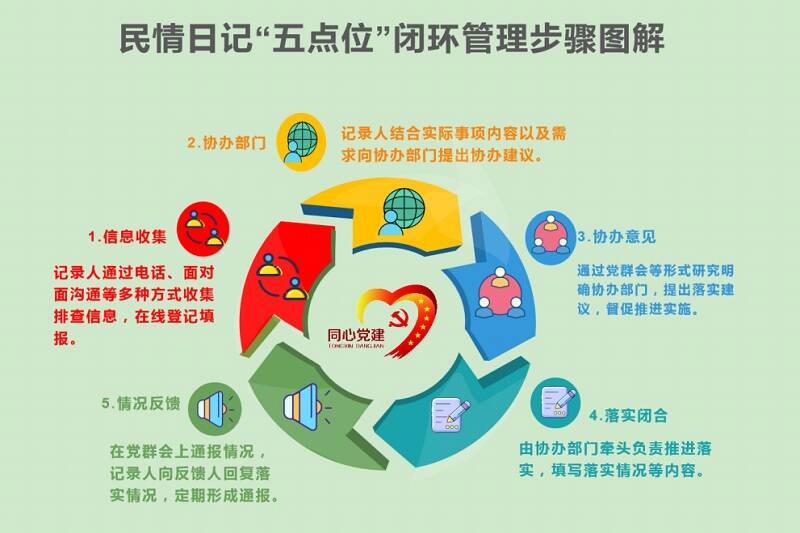“民情日记”实施“五点位”闭环管理。“第1点位”精准研判,对线上线下收集的各类信息进行精准分析研判,按照“一事一记”原则进行分类汇总、提报转送;“第2点位”协同联动,将确定立项的内容提交“联动转办事项清单”,协作联动、形成合力;“第3点位”推动落实,每周在党群部门工作例会上集中研究,拿出措施,敲定任务;“第4点位”跟踪闭合,通过“重点事项落实闭合单”形式完成事项流转的跟踪闭合;“第5点位”反馈回复,对于各类信息及诉求办理结果,及时反馈落实情况,最后进行归集存档。