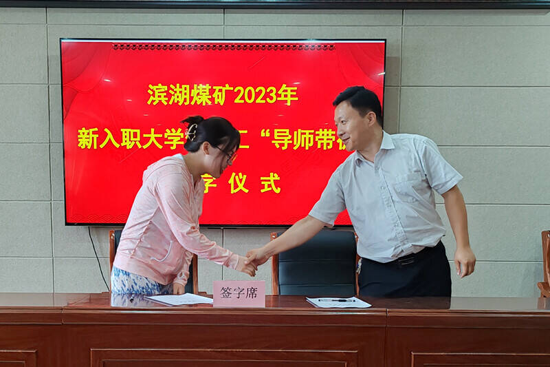 7月26日,2023年新入职枣矿集团滨湖煤矿的大学生员工何文格与2013年入职该矿的大学生、掘进工区主管工程师房端强一同走上签字席,在双方互换签订师徒协议后,握手表达了今后共同学习,一起成长的决心。