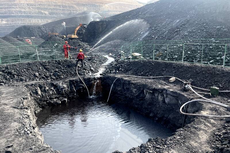 灭火水进入火区后,会再次回流到煤区底板,在低洼处形成积水。为更加高效利用水资源,8月上旬采剥二工区在煤区汇水点开挖了一个容积约180立方米的集水坑,然后用水泵将回收的“废水”通过临时管路连接至火区水枪。