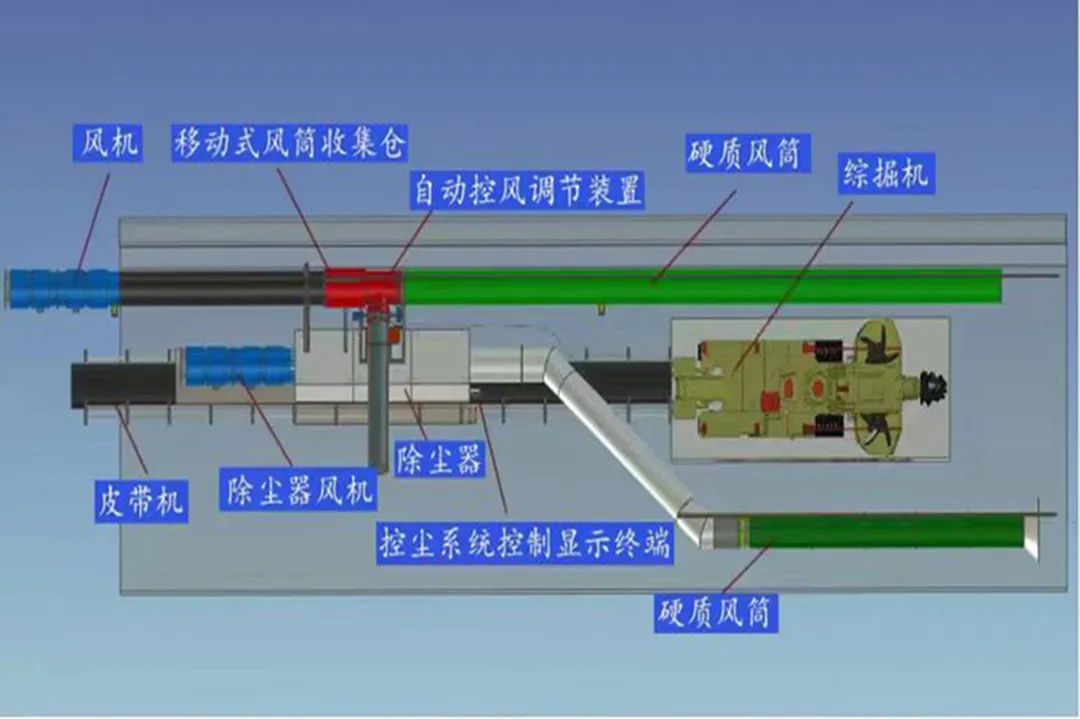 大功率局部通风机、除尘风机、控风调节装置、测风装置、风筒收集仓……各种设备设施依次安装,构成了除尘“神器”。正压供风、自动控风、精准测风、负压抽风,设备联控联动,实现全流程风流精确管控。