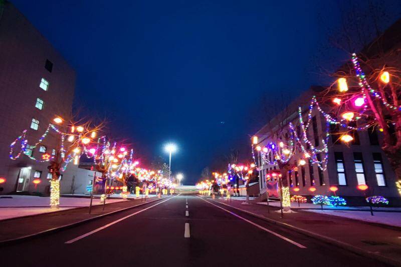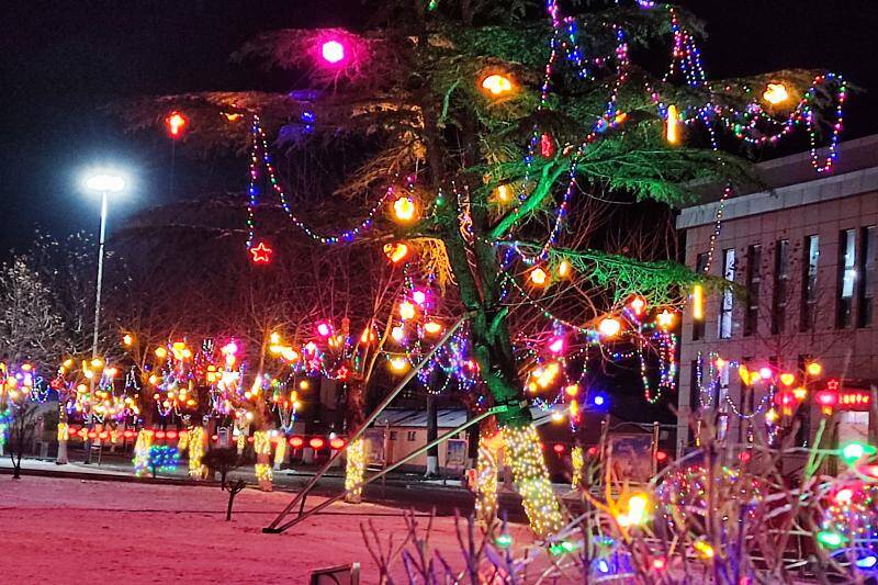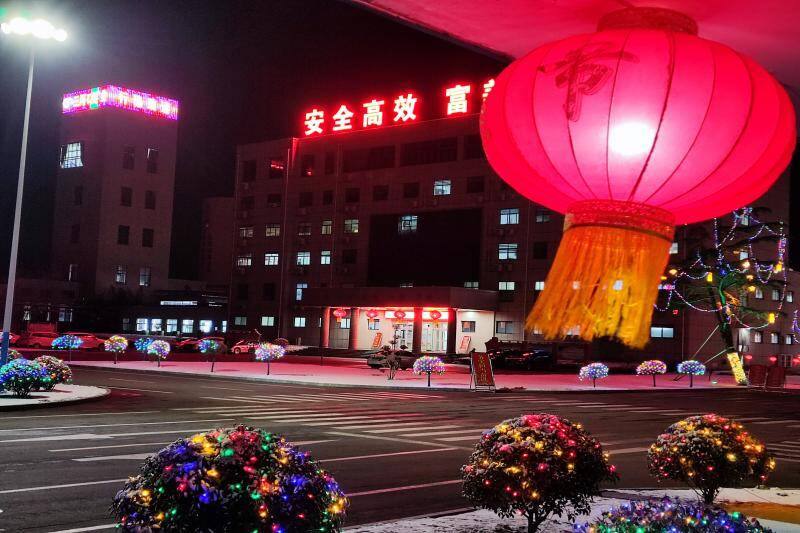 三河口矿业公司主干道上处处飘红,道路两侧、路灯下、法桐树枝上随处可见大大小小的红灯笼,福字、春字、欢度佳节等造型各异,五彩斑斓的彩灯把整个矿山点亮。在草坪中,冬青枝叶上包裹了球形的花灯,福气满满。红彤彤的灯笼与彩灯互相交织,形成了一幅幅绚丽多彩的画面,让人沉浸陶醉。