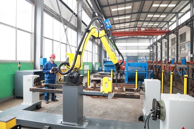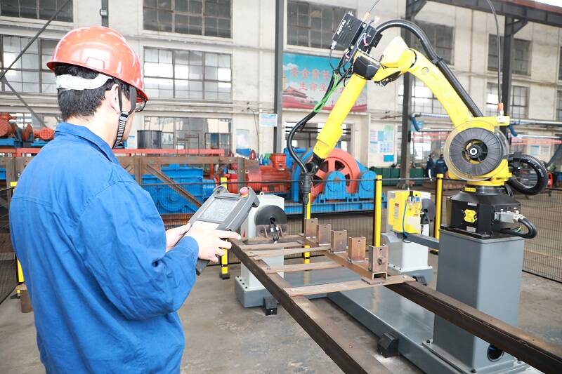 (职工正在操控智能铆焊机器人焊接管路托架)