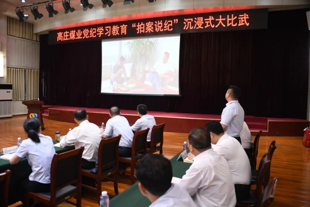 在高庄煤业公司近日举办的党纪学习教育“拍案说纪”沉浸式大比武中,该公司退管会党支部书记高瑞营沉稳而又流畅地分析案例。