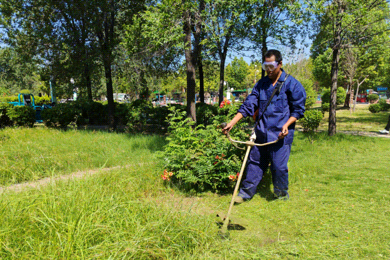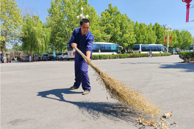 在广场的西北角,一个身影淹没在分不清是尘土还是漫天飞舞的草屑中,他斜背着打草机,手里握着像方向盘一样的操作手柄,低头关注着飞舞的切割台。打草机的轰隆声使杨师傅并未看到我们,黝黑的皮肤,高高瘦瘦的身材,满身的草渣、满脸的汗水是我对他最初的印象。