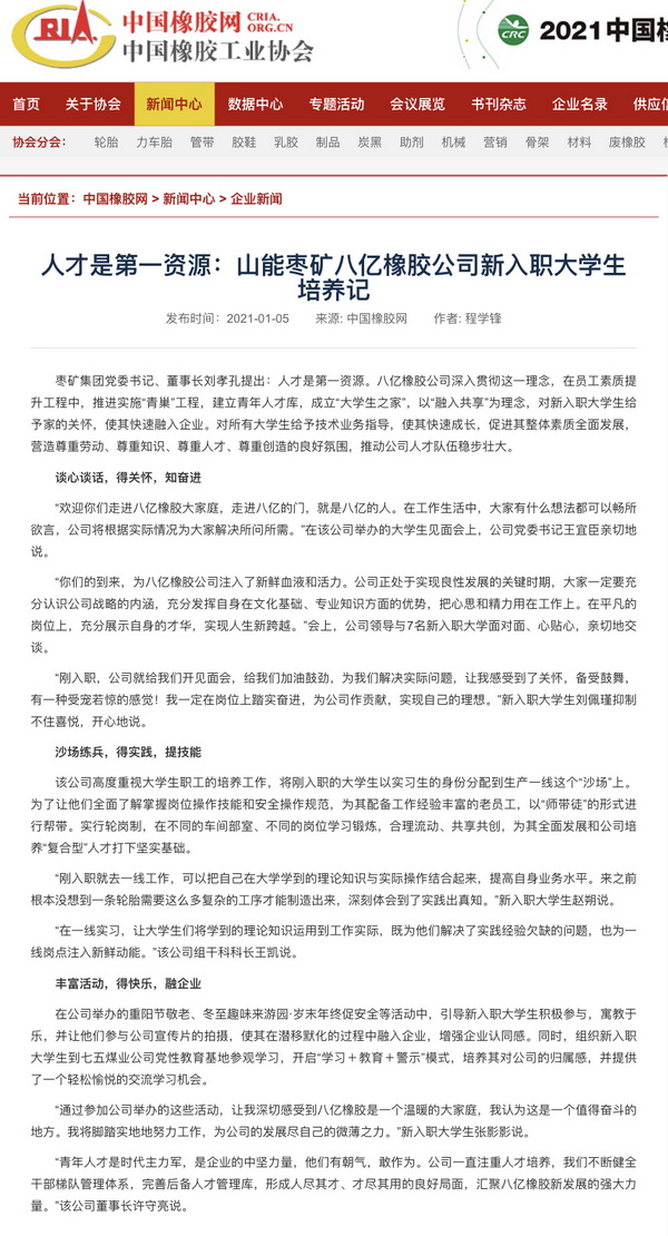 集团公司党委书记、董事长刘孝孔提出:人才是第一资源。八亿橡胶公司深入贯彻这一理念,在员工素质提升工程中,推进实施“青巢”工程,建立青年人才库,成立“大学生之家”,以“融入共享”为理念,对新入职大学生给予家的关怀,使其快速融入企业。对所有大学生给予技术业务指导,使其快速成长,促进其整体素质全面发展,营造尊重劳动、尊重知识、尊重人才、尊重创造的良好氛围,推动公司人才队伍稳步壮大。
