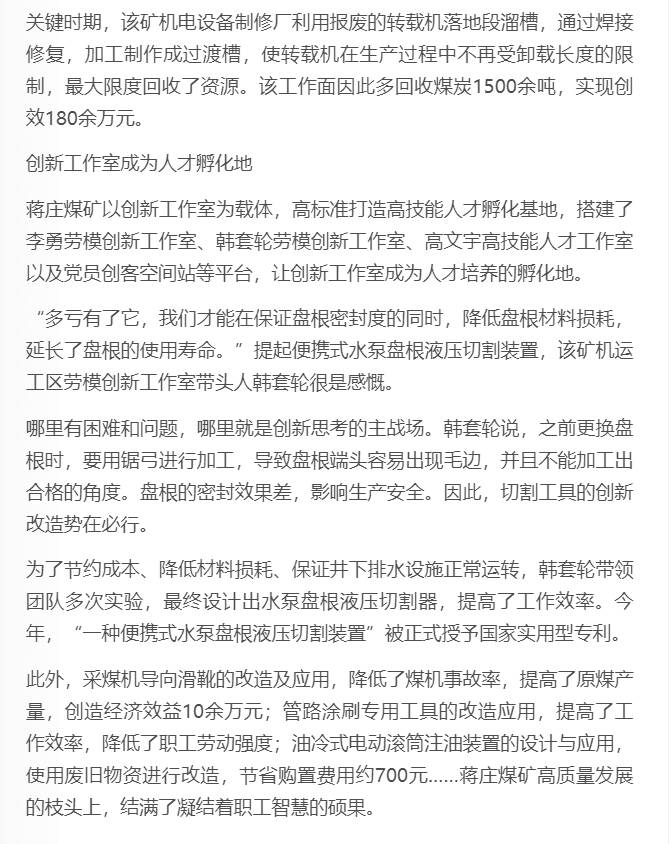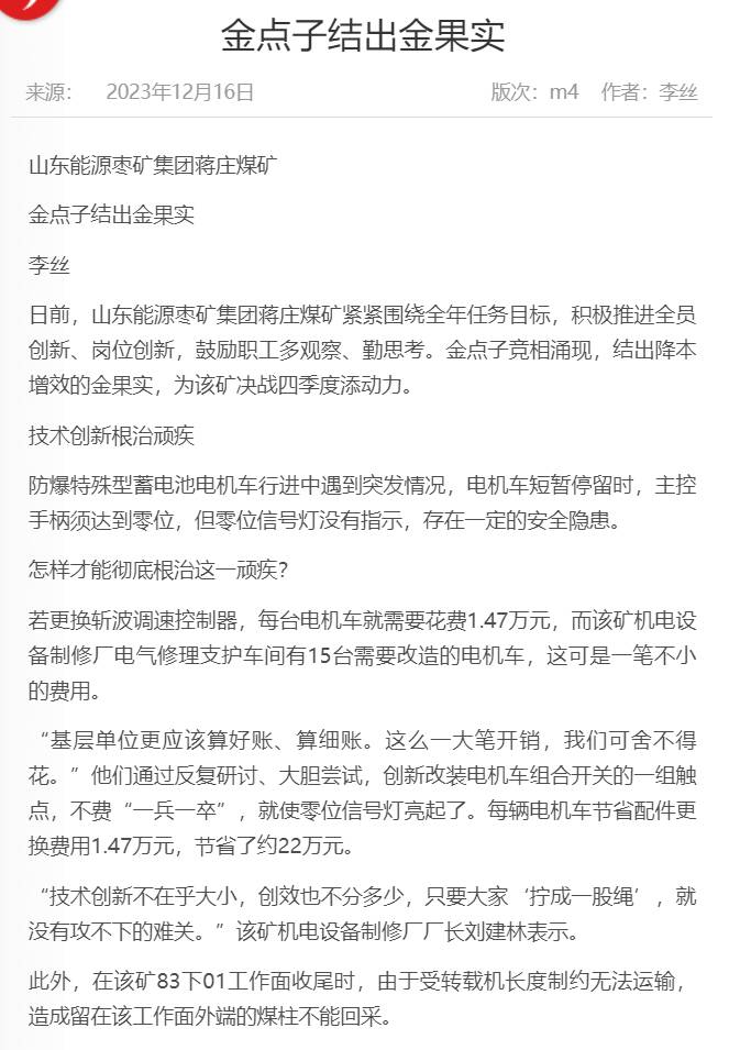 【中国煤炭报】山东能源枣矿集团蒋庄煤矿 金点子结出金果实