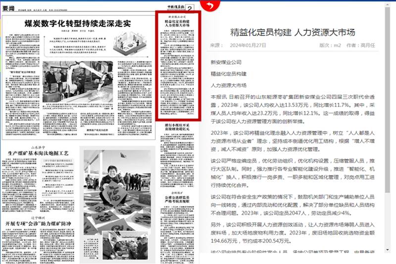 本报讯:日前召开的山东能源枣矿集团新安煤业公司四届三次职代会透露,2023年,该公司人均收入达13.53万元,同比增长11.7%。其中,采煤人员人均年收入达23.2万元,同比增长12.1%。这一成绩的取得,得益于该公司在人力资源管理方面的创新举措。