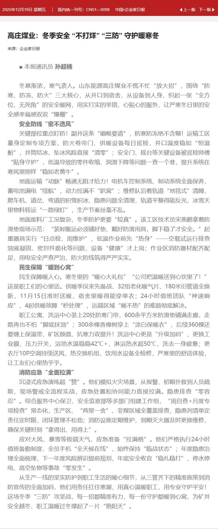 【企业家日报】高庄煤业:冬季安全“不打烊”“三防”守护暖寒冬