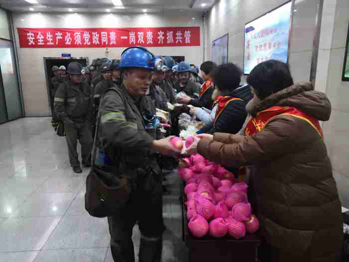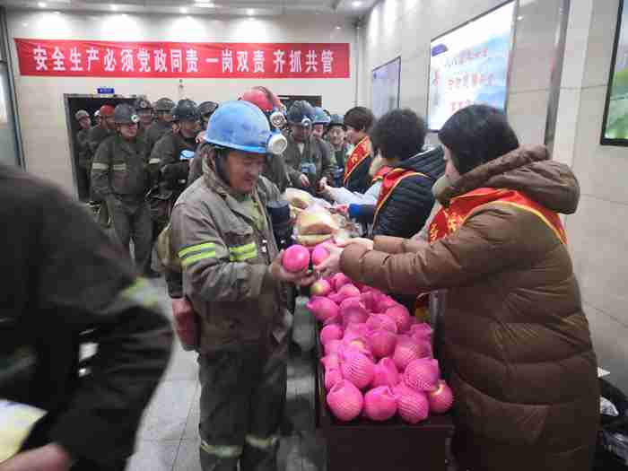 12月20日,在冬至来临之际,李楼煤业工会组织家属协管员,在副井口开展了“迎冬至、送平安”井口送温暖活动,为广大一线员工送上苹果、面包、火腿肠等“冬至祝福”,并叮嘱他们“安全上岗、平安回家”。