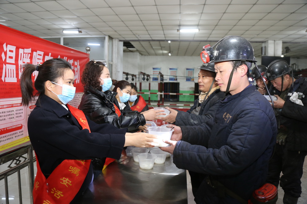 在井口大厅女工协管员、青年志愿者将一碗一碗寓意平安、圆满的汤圆送到上下井职工手中,向他们送上节日的祝福,并嘱咐他们时刻注意安全,杜绝违章,确保矿井安全生产。
