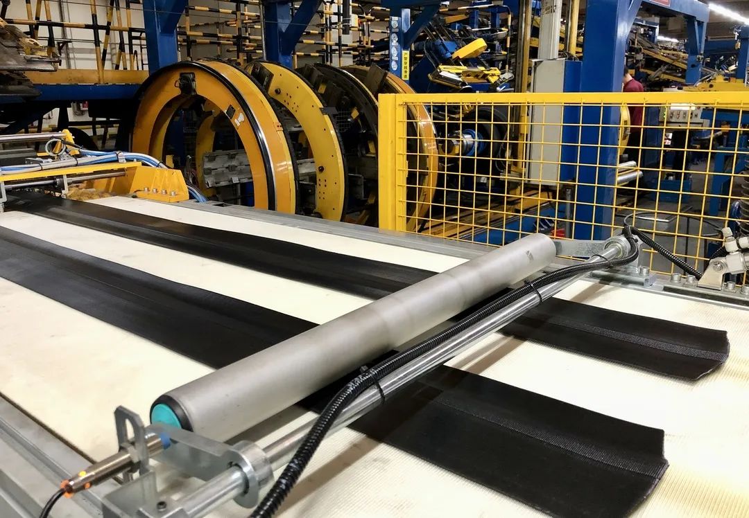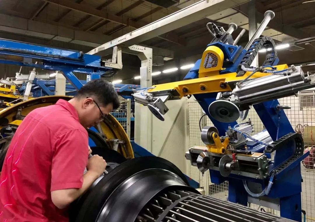 近日,笔者在八亿橡胶公司成型车间看到,6号成型机正在使用改造后的新式后压车对胎冠、胎面、垫胶、胎侧等多角度、多部位滚压。
