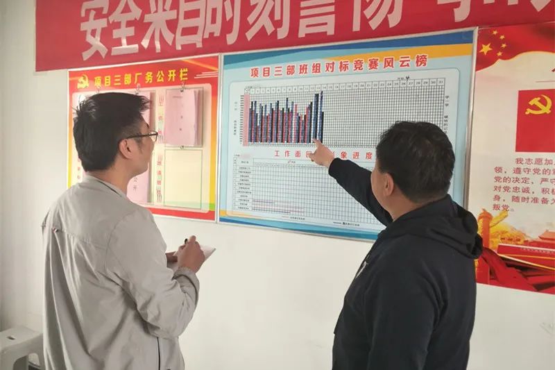 他们每周公布各项工程进度和计划进度对比图,每天早会通报各级管理人员履职情况,各项目部围绕安全、质量、工效举办擂台赛,在干部与干部、班组与班组、项目部与项目部之间形成了学干比超的浓厚氛围。