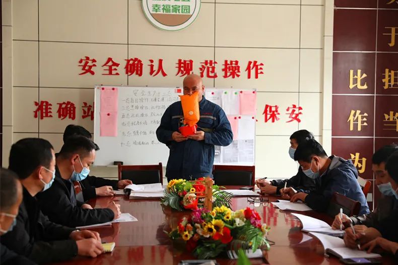 5月23日,在七五煤业公司综采工区班前会中,当天的安全宣教“今日头条”播报员是来自通防科的赵伟,播报的内容是如何正确使用自救器。