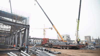 “我们在储煤棚管桁架加工末期,就对栈桥加工排定生产计划,提前采购钢材,把图纸吃透,采取车间加工成段、成片,现场组装成箱型架、整体吊装的施工办法,大大缩短了施工周期,着力为设备安装争取时间。”钢结构安装负责人刘伟说,目前,已有3跨栈桥运往施工现场,完成总加工量的45 %。