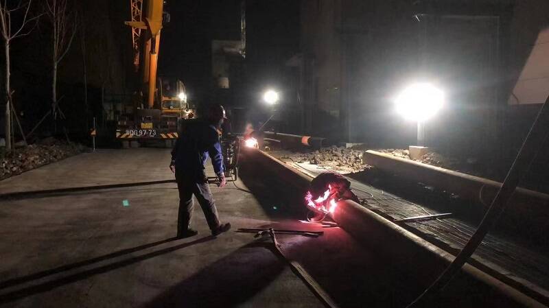 27日凌晨5点多,罗小东从容地指挥着吊车起落一截管道至蒸汽管道合口处,稳妥对口后,电焊工张勇峰立刻上去进行氩弧焊接打底工作,整个过程如行云流水、一气呵成,半小时后最后一道焊口完成焊接。至此,最后一段管道安装工序顺利完成,为最终开展蒸汽暖管流量计安装预留了宝贵的时间。
