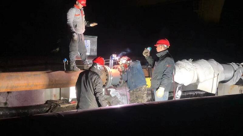 11月27日凌晨,在枣矿集团富源电厂二期蒋庄煤矿供暖管路施工现场,机器轰鸣,灯光明亮,管路主体各项安装工程已经完成,蒸汽暖管流量计安装工作还在有条不紊地进行当中,焊枪飞出的火花四处飞溅,一派热火朝天的工作场面。