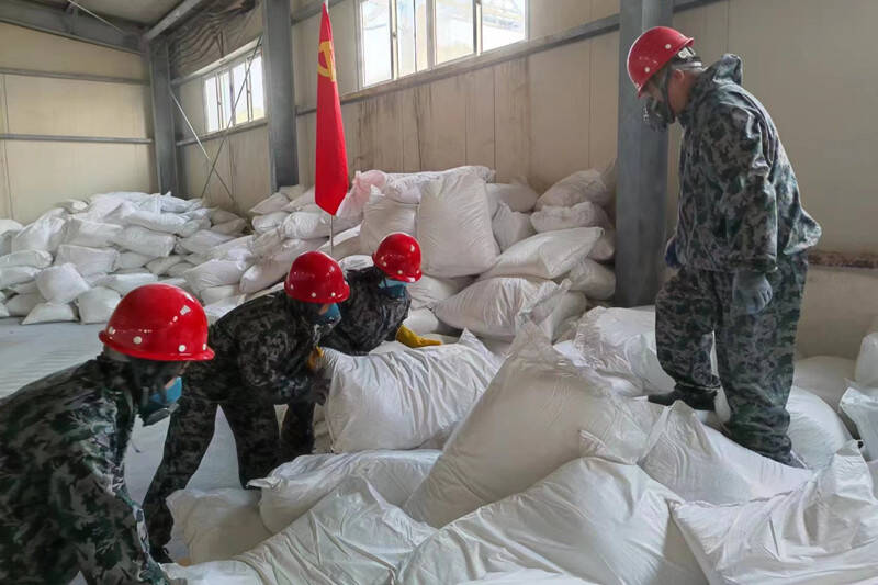 (弘兴公司管理人员主动投入到超细白炭黑装卸车工作中)
