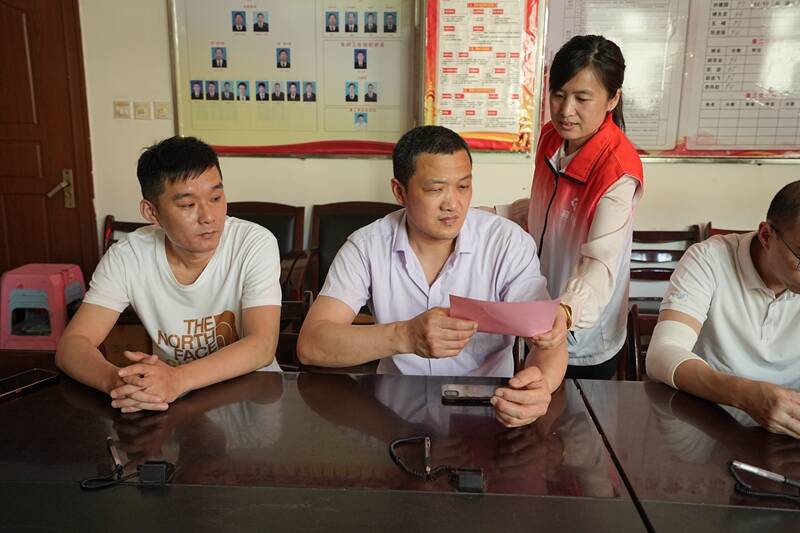 (“高玫心”成员正在给职工发放宣传资料)