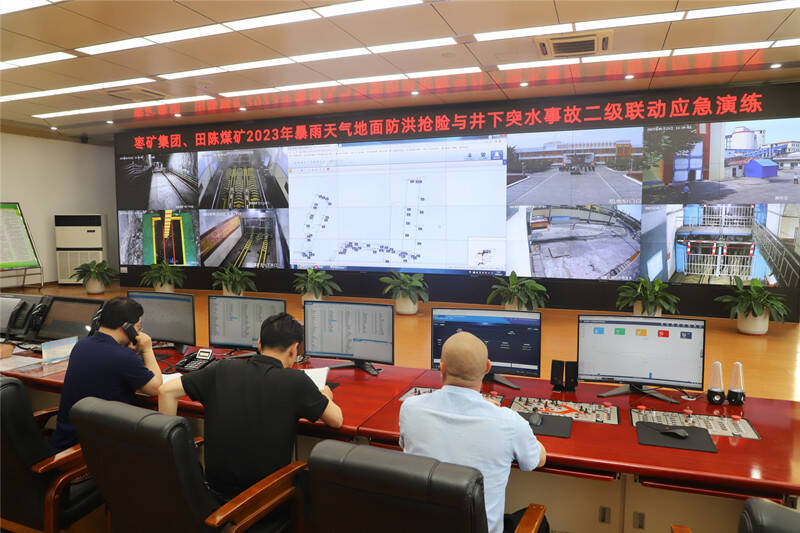 据悉,此次演练模拟田陈煤矿暴雨天气12小时连续观测降雨量达到50mm,并继续增长,同时井下723下01工作面机尾出现突水,且水量有增大趋势,威胁现场及周边作业人员安全。接到报告后,枣矿集团和田陈煤矿立即启动应急响应,指导协调现场救援决策,提供抢险支持,最终成功处置井上下险情的全过程。