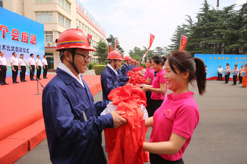 仪式上,技术比武选手代表李延龙、裁判员代表梁冉冉作表态发言,女工协管员为采掘一线职工“送平安”。