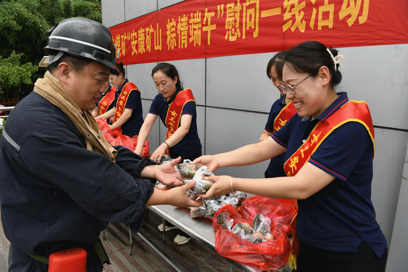 新鲜出炉、美味可口的粽子作为“端午节礼物”,被女工协管员送到一线职工手中,“师傅,您辛苦了,端午节安康!吃个粽子,下井多注意安全……”“送您一条平安红腰带,在井下一定注意安全,按章操作……”一个个香甜的粽子,一句句暖心的话语,温馨、关爱溢满整个活动现场,女工协管员们个个喜笑颜开,热情地将粽子、鸡蛋等慰问品送到职工手中,叮嘱他们一定要时刻牢记安全,遵章作业,暖心的话语,真情的祝福,感染着在场的矿工兄弟。