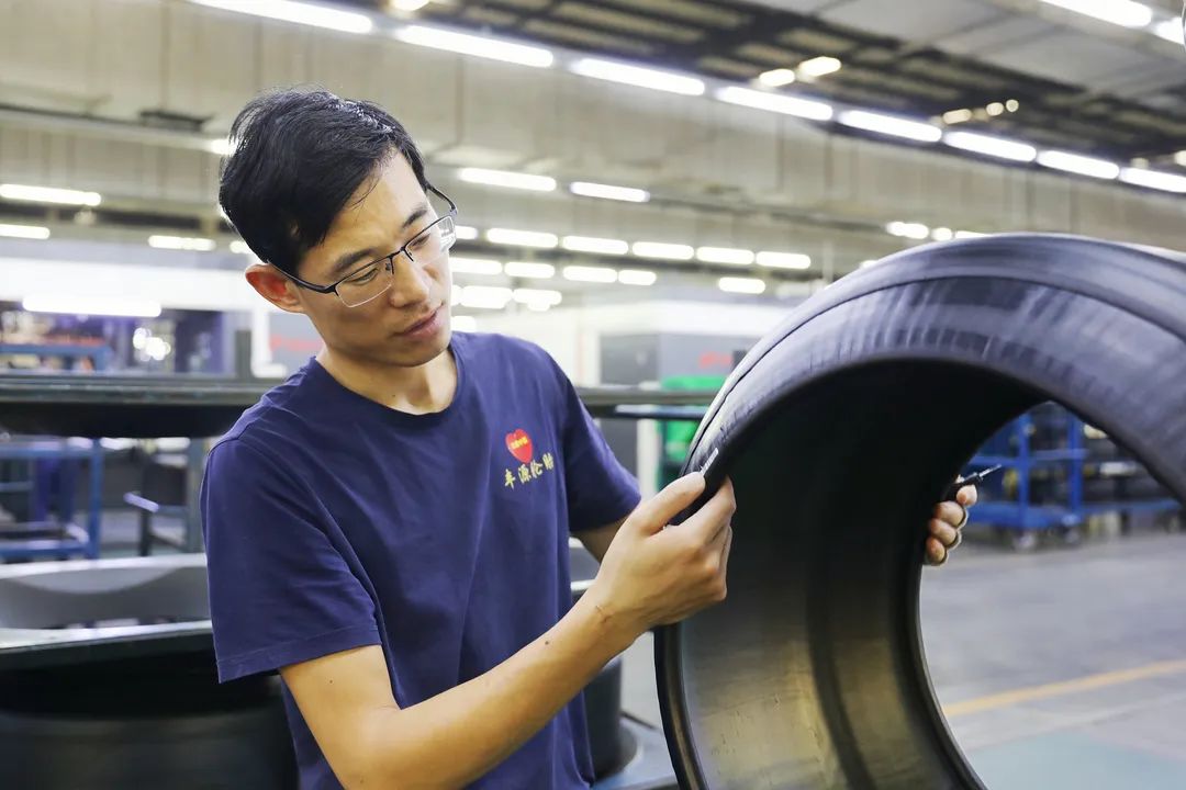 丰源轮胎公司成型车间操作主手刘志渠,正在为刚生产的轮胎胎胚贴“身份证”,保证产品质量。