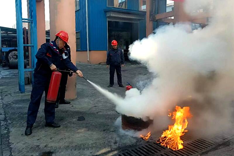(职工正在进行灭火器实操演练)