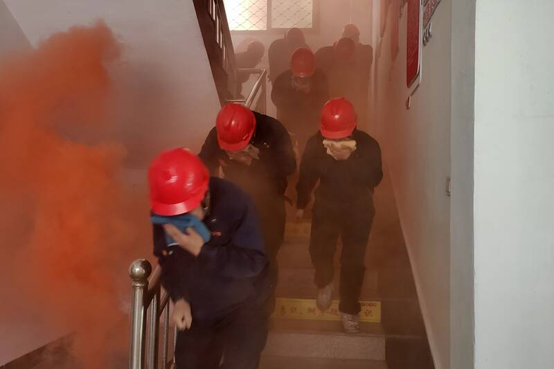 (职工正在进行应急消防疏散逃生演练)