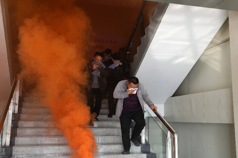 “遇到火灾要用湿毛巾捂紧口鼻,贴着墙壁弯腰往最近的安全出口走。”当火情警报声响起,职工们迅速行动起来,在消防员的专业引导下,用湿毛巾捂住口鼻,躬下身子迅速撤离工作岗位。仅用30秒时间,职工全部“脱险”,抵达安全区域。
