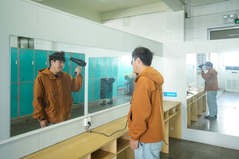 在职工洗浴区域,“幸福感”同样拉满。南北洗浴厅里,电视机、按摩椅、吹鞋机等设施一应俱全,舒适的座椅、精致的梳妆台,让职工在洗浴之余,还能享受片刻悠闲时光。同时,在南更衣室加装多组不锈钢晾晒架,划分独立格位并配备挂钩与标识牌,让毛巾有了“专属领地”,解决了毛巾晾晒难题。