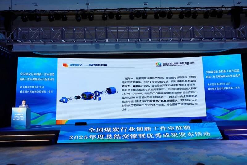 近日,全国煤炭行业创新工作室联盟在鄂尔多斯召开了2025年度总结交流暨优秀成果发布活动。枣矿集团蒋庄煤矿韩套轮劳模创新工作室研发的“矿用电机车高磁通驱动技术的研究与应用”项目,作为6项现场展示成果之一登场,以国际先进水平的技术突破赢得行业广泛赞誉。