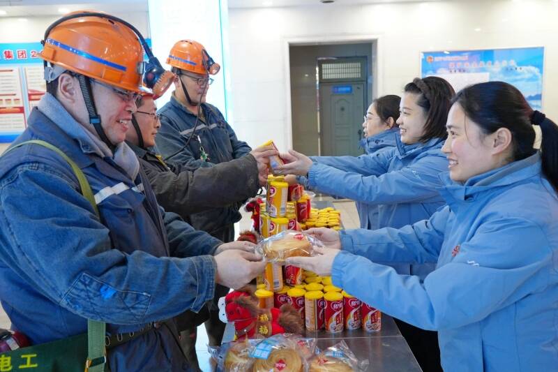 “师傅,辛苦了!喝碗腊八粥暖暖身子,下井注意安全!”“吃个平安果,一年都平平安安!”“蒋心连心”女工协管员热情地将一份份暖心礼包递到职工手中。香甜的腊八粥驱散了冬日的寒意,真挚的问候温暖了每一位职工的心田。