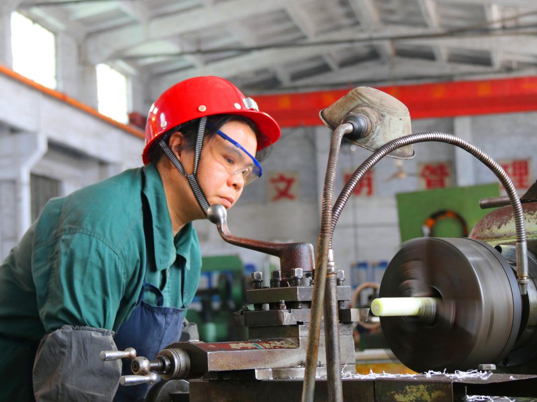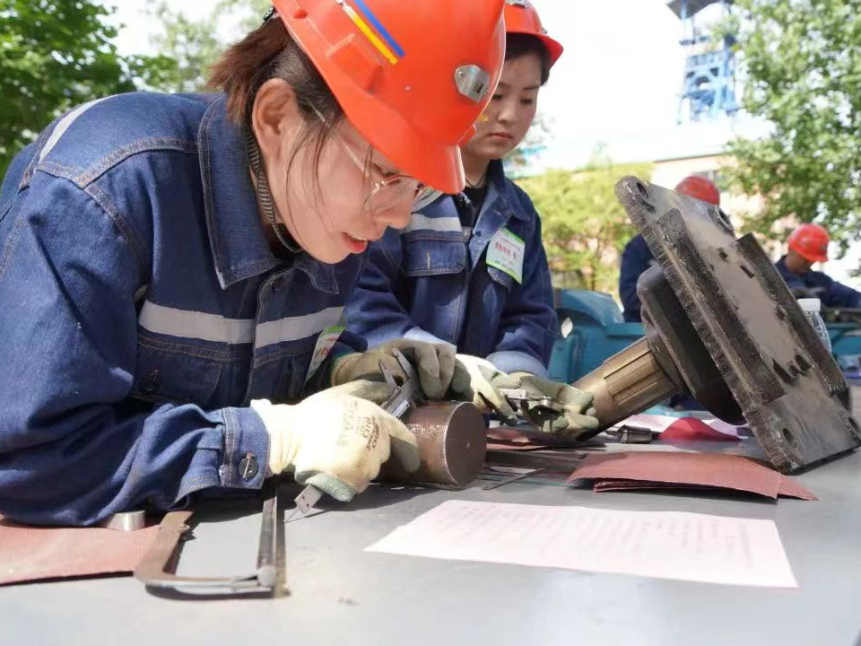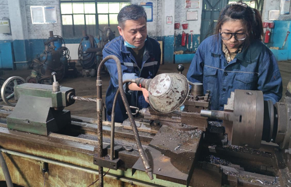 在修复3下226工作面损坏的无极绳绞车的液压锁车时,有4条M33*2的特殊螺丝损坏,急需加工,女工刘逸晨积极参加实景“微课”,车工大拿张建臣“现场教学”,张工是左移一下,上抬一点,嘴里还不断的强调着进刀的注意事项,不一会功夫就加工出一个工件,完成了车削工作。及时解决了井下紧急任务,女工刘逸晨也收获了满满的“干货”,甚是开心。