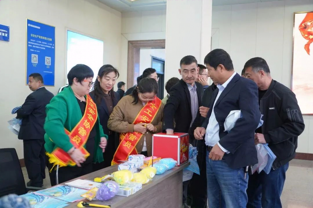 副井口大厅热闹非凡,女工协管员发放职业病防治宣传单。同时,她们把安全生产法律法规的内容制作成小纸条,集中放在一个抽奖箱里,让现场职工随机抽取,并准备了牙膏、香皂、洗发水作为奖励进行发放,答题现场气氛热烈,职工们踊跃参加。