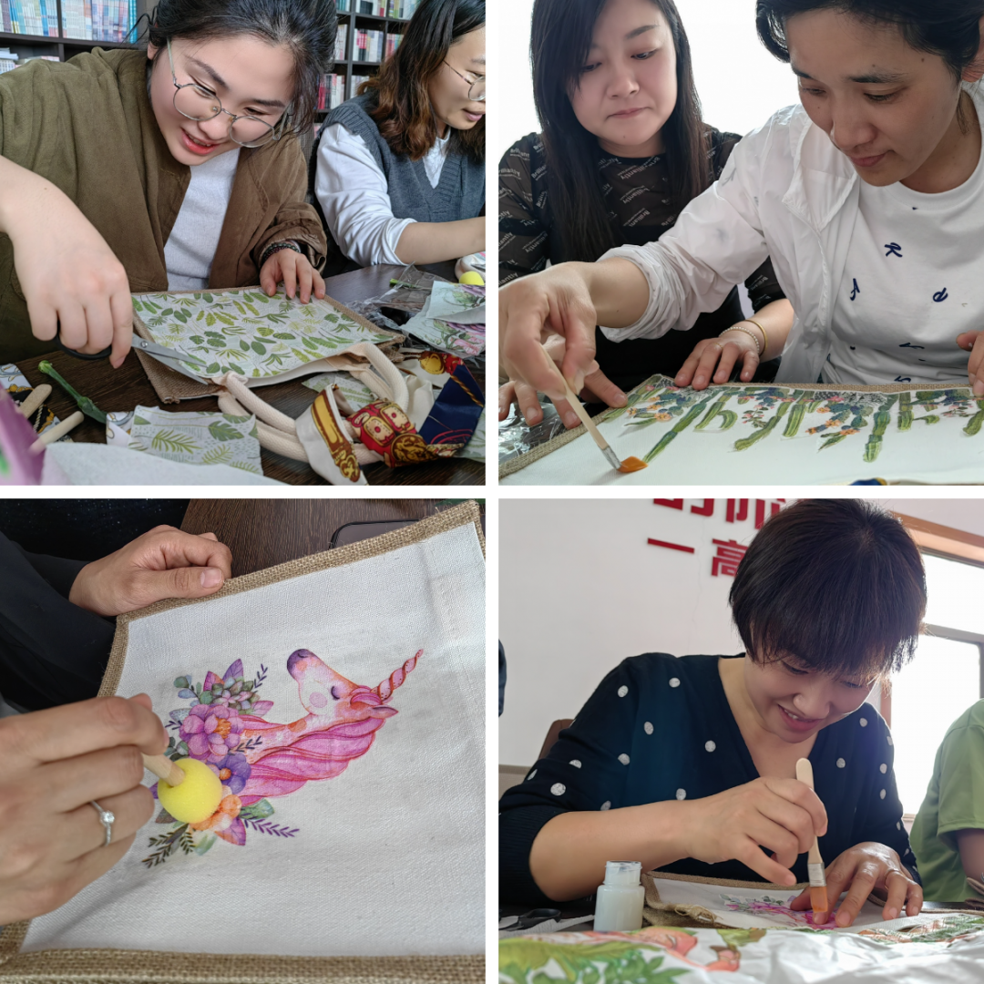 “相遇半小时光”——手工活动环节,女工们一起DIY蝶骨巴特麻布包,将美丽图形剪裁、拼贴装饰于麻布包上,为母亲节送上自己的特殊礼物。在主持人的引导下,大家纷纷挑选了自己喜欢的图案,开始制作起来。剪裁、拆分、刷胶、粘贴……大家或聚在一块儿边做边讨论,或专注于自己手下的包包,很快,一个个风格迥异的麻布包出现在眼前,有的清新淡雅,有的俏皮可爱。